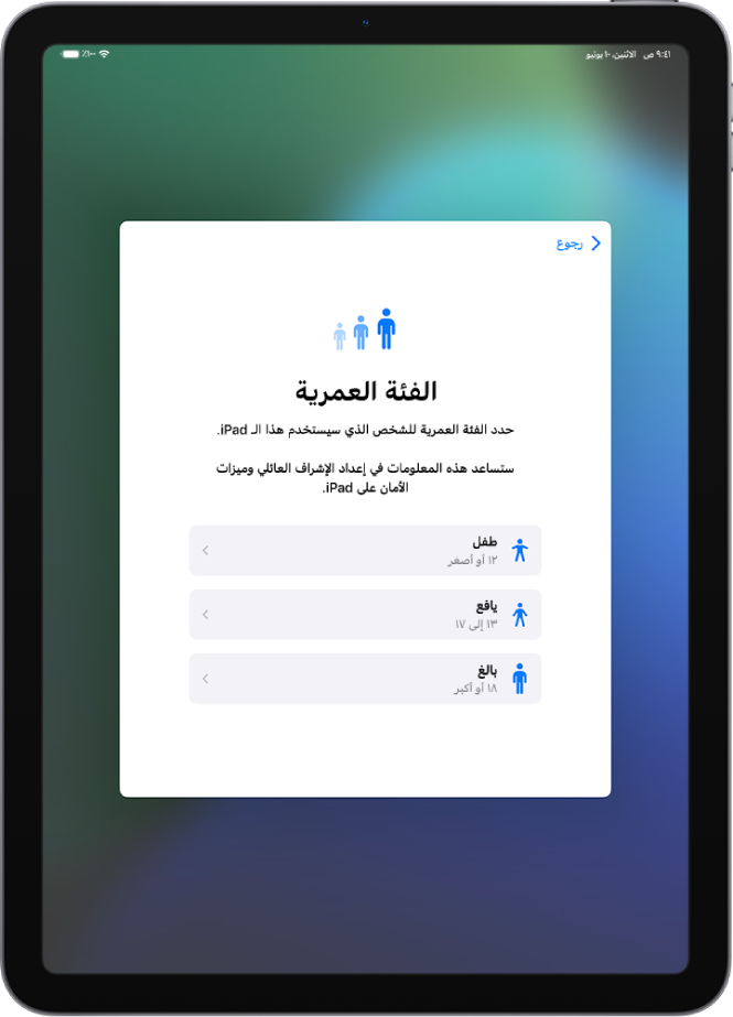 إذا كان عمر طفلك 12 عامًا أو أقل، يجب توصيل iPad بجهاز أحد الوالدين أو الوصي.