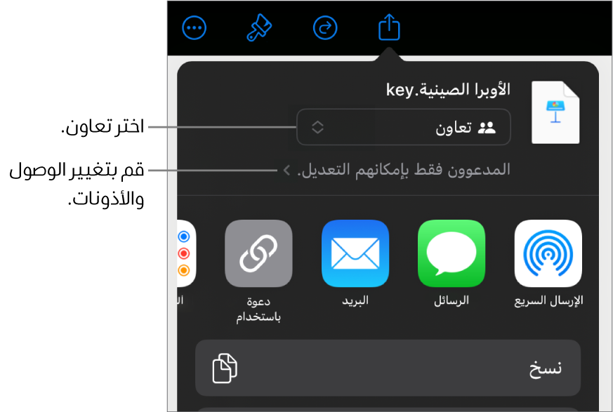 اضغط على المشاركة مع مزيد من الأشخاص، ثم اختر طريقة لإرسال الدعوة للتعاون: