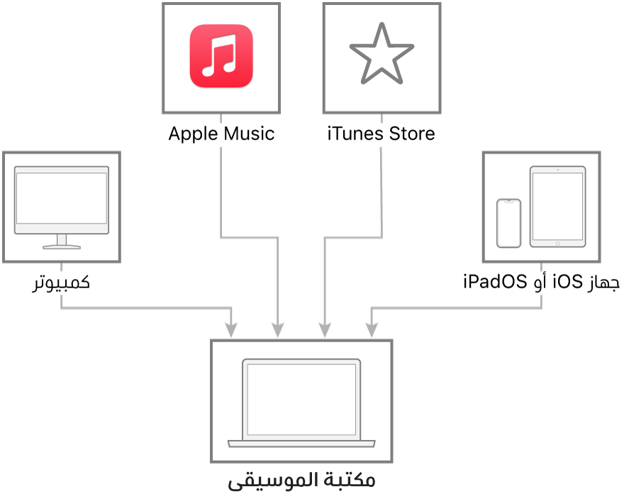 إذا كنت غير مشترك في Apple Music وتريد إضافة الأغاني أو الألبومات المفضلة لديك، يمكنك شراء الموسيقى وتنزيلها من iTunes Store. وإذا كنت قد اشتريت عناصر من iTunes Store سابقًا، يمكنك تنزيلها على أجهزة الكمبيوتر والأجهزة المخولة (بحد أقصى 10 أجهزة إجمالًا).