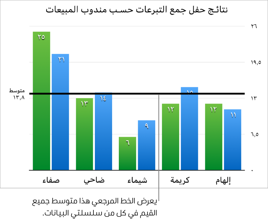 يمكنك إضافة خطوط المرجع إلى المخطط للإشارة إلى قيم المتوسط او الوسيط أو الحد الأدنى أو الحد الأقصى في المخطط. تساعد خطوط المرجع على تسهيل فهم المخطط في لمحة سريعة، كما يمكن أن تساعدك على مقارنة القيم في المخطط بقيمة إرشادية.