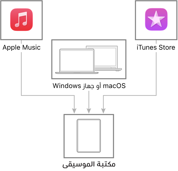 وصِّل Mac أو جهاز Windows لنقل الموسيقى وتحديثها بين iPad وجهازك. لمزامنة المحتوى المدعوم، استخدم تطبيق الموسيقى (في macOS 10.15 أو أحدث) أو iTunes (في macOS 10.14 أو أقدم وأجهزة Windows).