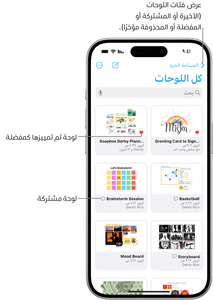 في الزاوية العلوية اليمنى، ثم اضغط على لوحة.العثور على لوحة فتحتها مؤخرًا، أو شاركتها مع الآخرين، أو وضعتها ضمن المفضلة: اضغط على