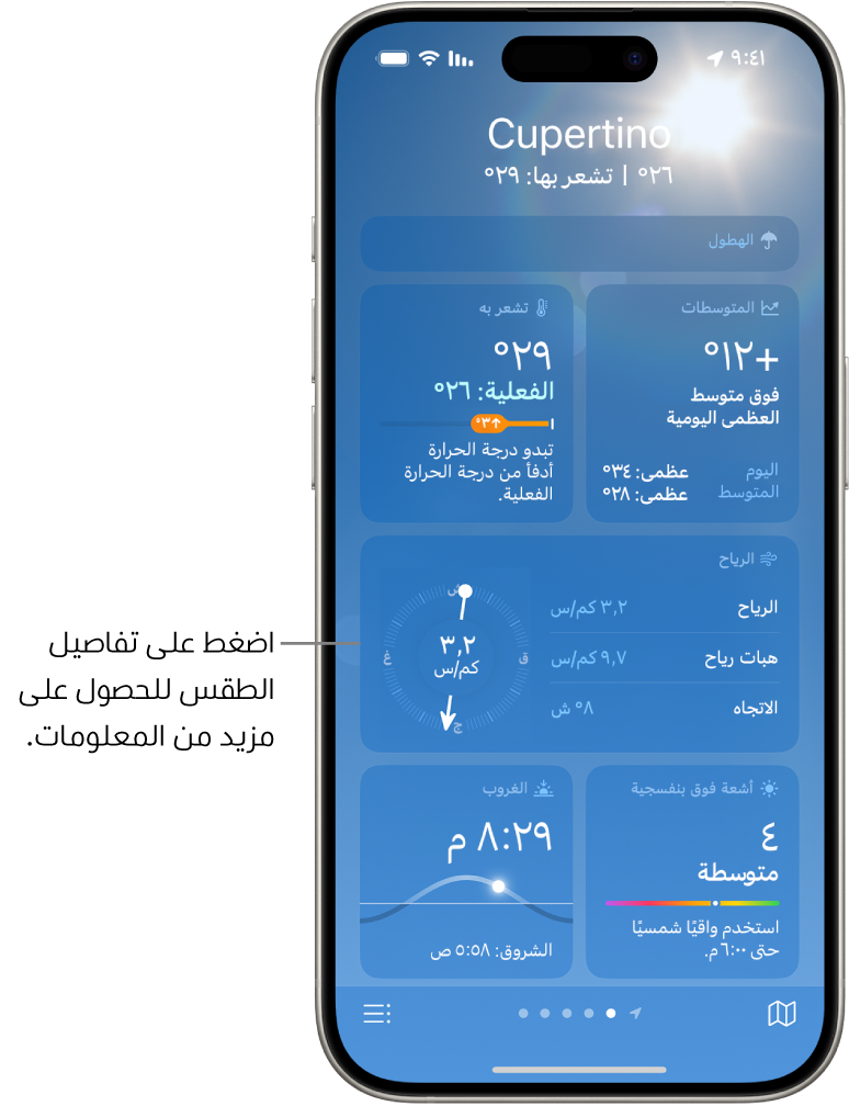 ملاحظة: بعض ميزات تطبيق الطقس -مثل تنبيهات الطقس القاسية، وجودة الهواء، وهطول الأمطار في الساعة التالية، والأخبار- غير متوفرة في جميع البلدان والمناطق. لمعرفة المزيد حول مصادر البيانات في تطبيق الطقس، انظر مقال دعم Apple توفر الميزات ومصادر البيانات في تطبيق الطقس.