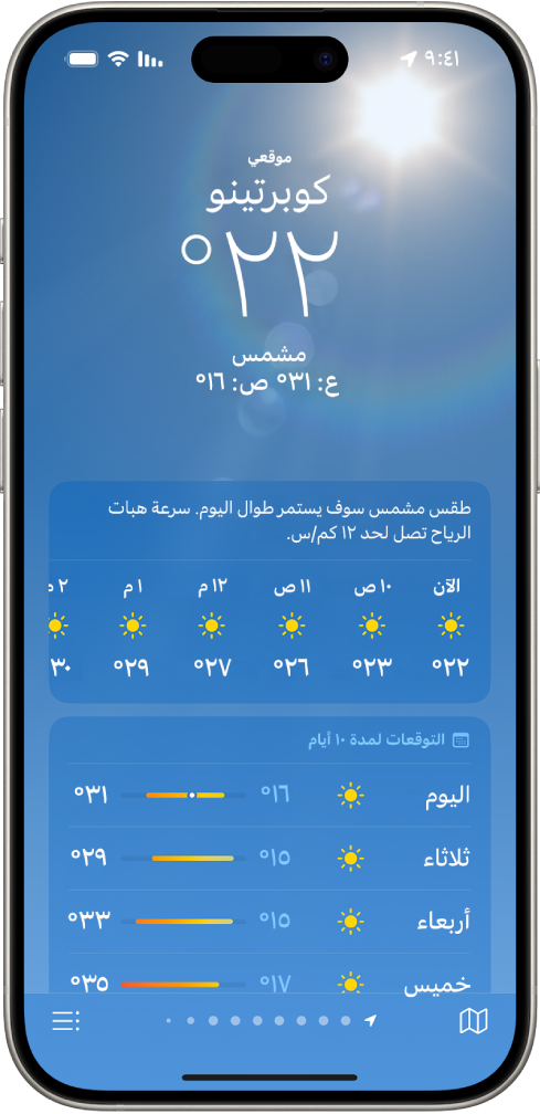 على iPhone.تظهر تفاصيل موقعك الحالي. انظر معرفة أيقونات الطقس.