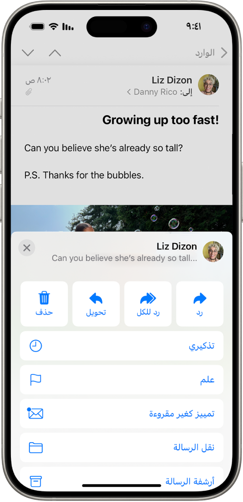 يمكنك الرد على رسائل البريد الإلكتروني أو إعادة توجيهها في تطبيق البريد.