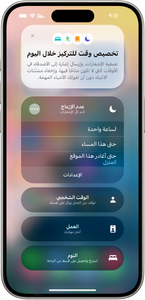 Siri: اطلب من Siri شيئًا ما مثل، "Turn on the Work Focus". تعرَّف على كيفية استخدام Siri.