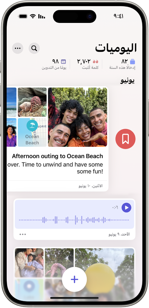 في تطبيق اليوميات على iPhone، يمكنك البحث عن نص في إدخالاتك وفلترة التفاصيل مثل الصور والرسومات والمواقع. يمكنك أيضًا وضع إشارة مرجعية على الإدخالات للاطلاع عليها لاحقًا.