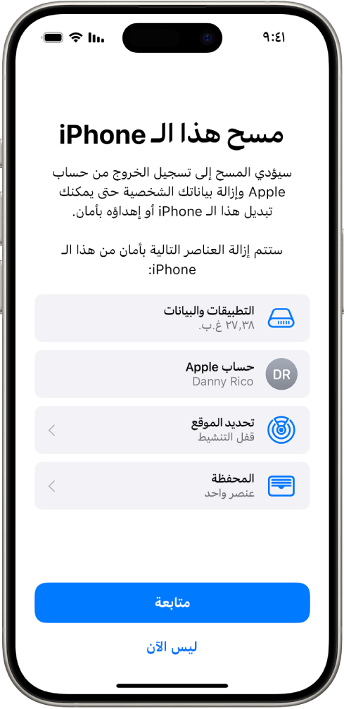 إذا كان لديك شريحة إلكترونية، يمكنك اختيار مسح الشريحة الإلكترونية أو الاحتفاظ بها. إذا مسحت الشريحة الإلكترونية، فستحتاج إلى الاتصال بشركة الاتصالات لإعادة تنشيط خطتك الخلوية.