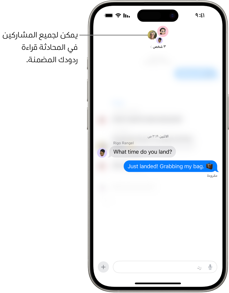 .ملاحظة: يمكن لأي شخص في محادثة جماعية رؤية ردك المضمن. لإرسال رد خاص، اضغط على أيقونة المجموعة في أعلى المحادثة، المس أيقونة الشخص المراد إرسال رسالة خاصة إليه مطولًا، ثم اضغط على رسالة.