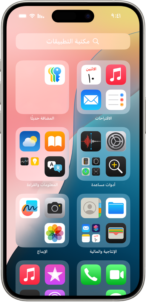 تعرض مكتبة التطبيقات تطبيقاتك منظمة في فئات، مثل اجتماعي وترفيه وإنتاجية وتمويل. تقع التطبيقات التي تستخدمها كثيرًا بالقرب من أعلى الشاشة وفي المستوى الأعلى لفئاتها، بحيث يمكنك تحديد موقعها وفتحها بسهولة.