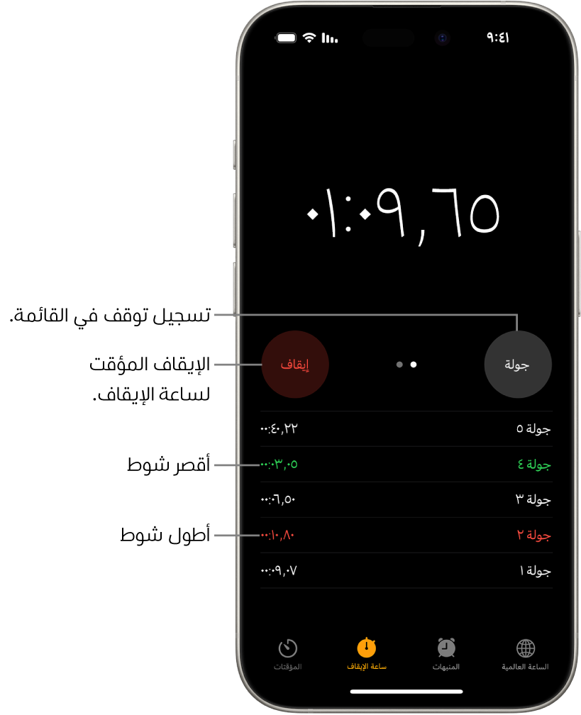 يمكنك استخدام ساعة الإيقاف لقياس مدة حدث معين.