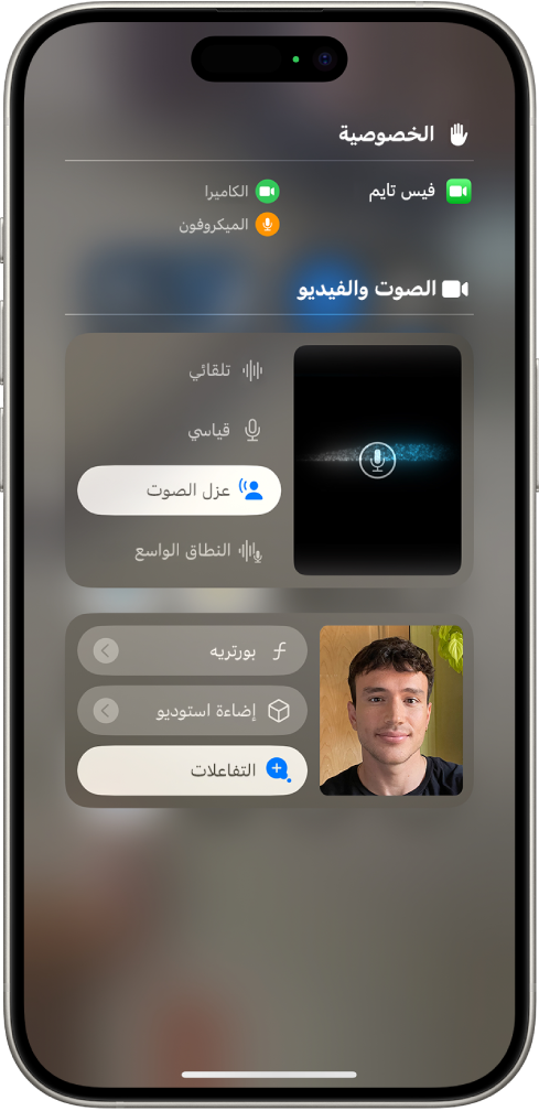 على iPhone، افتح مركز التحكم.اضغط على فيس تايم، ثم حدد عزل الصوت.
