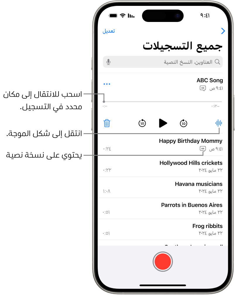 (الموجود في مجلد الأدوات المساعدة) على جهاز iPhone.في قائمة التسجيلات، اضغط على التسجيل الذي تريد تشغيله، ثم اضغط على