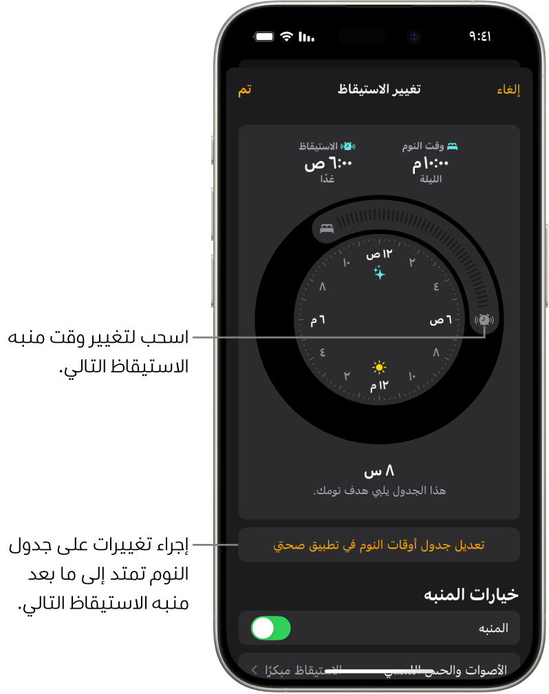 بإمكانك إجراء تغييرات على منبه الاستيقاظ إذا قمت بإعداد جدول نوم في تطبيق الصحة.
