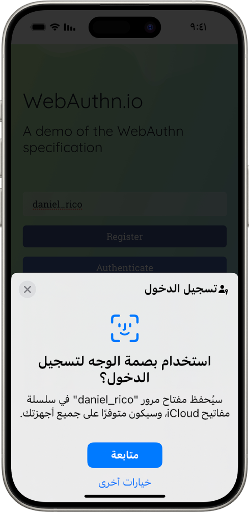 يكمل مفتاح المرور الذي تم حفظه على سلسلة مفاتيح iCloud تسجيل الدخول تلقائيًا.