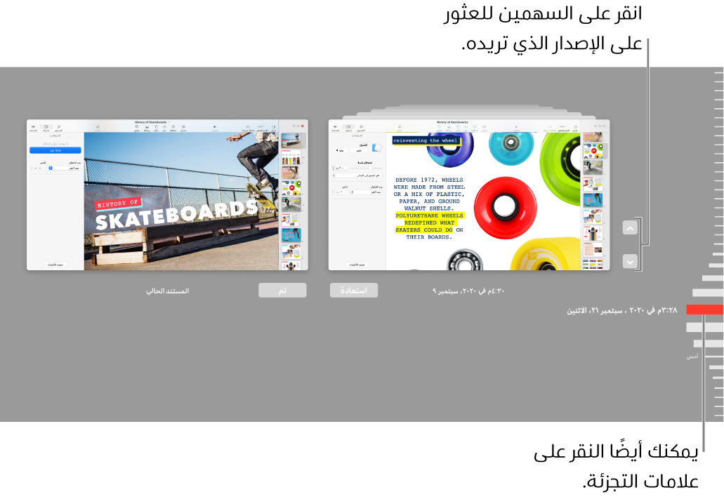 لعرض الإصدارات السابقة، انقر على علامات التجزئة بطول المخطط الزمني أو انقر على الأسهم المجاورة لمكدس صور العرض التقديمي المصغرة على اليمين، ثم انقر على صورة مصغرة لعرض الإصدار كامل الحجم.