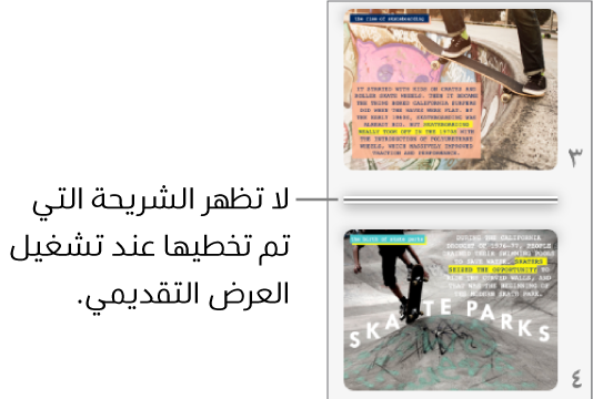 إذا كنت لا ترغب في تشغيل شريحة ما أثناء العرض التقديمي، يمكنك تخطيها. يفيد التخطي عندما ترغب - على سبيل المثال - في الاحتفاظ بإصدارين من شريحة ما لكنك ترغب في إظهار واحدة منهما فقط. يمكنك تحديد الشرائح التي تم تخطيها وتعديلها كما تفعل مع الشرائح الأخرى تمامًا. إذا اخترت إظهار الشرائح التي تم تخطيها، فإنها تظهر كأشرطة أفقية في متصفح الشرائح وكصور مصغرة باهتة في عرض الطاولة الضوئية.