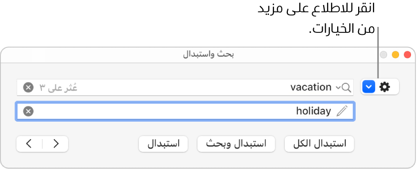 في شريط الأدوات، ثم اختر إظهار البحث والاستبدال.انقر على القائمة المنبثقة على يمين حقل النص العلوي، ثم اختر بحث واستبدال.