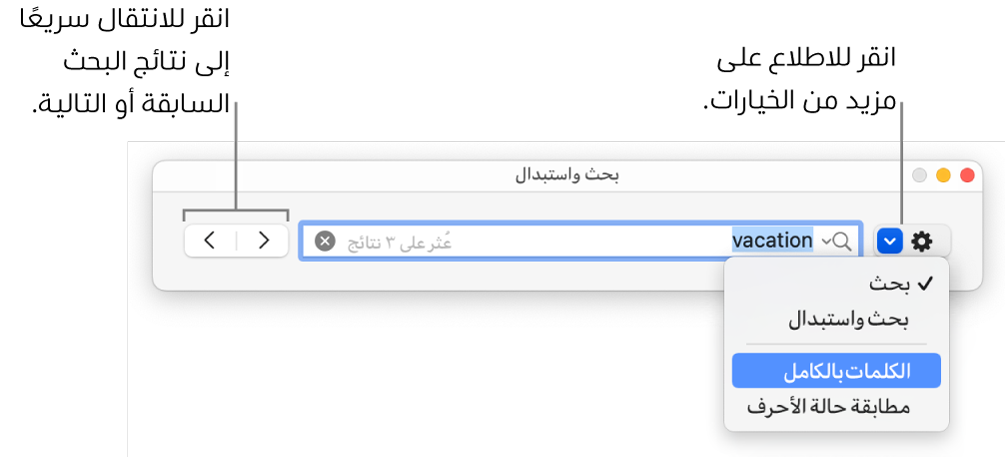 لحصر نتائج البحث إما على كلمات بأكملها أو على كلمات تطابق الكتابة بالأحرف الكبيرة التي تحددها، انقر على القائمة المنبثقة على يمين حقل البحث، ثم اختر الكلمات بالكامل أو مطابقة حالة الأحرف (أو كليهما).
