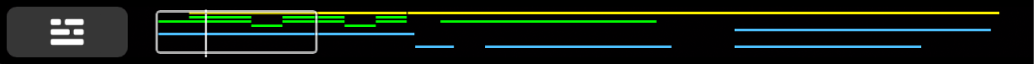 The Overview screen is a representation of the Tracks area in Logic Pro, with regions appearing as thin horizontal lines the color of their track type. The view rectangle shows the part of the project currently visible, with the vertical line showing the playhead position.
