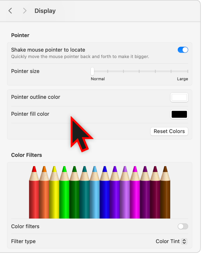 إذا كنت تواجه صعوبة في رؤية المؤشر أو تتبعه، يمكنك تغيير حجمه ولونه بحيث يسهل تحديد موقعه على الشاشة.