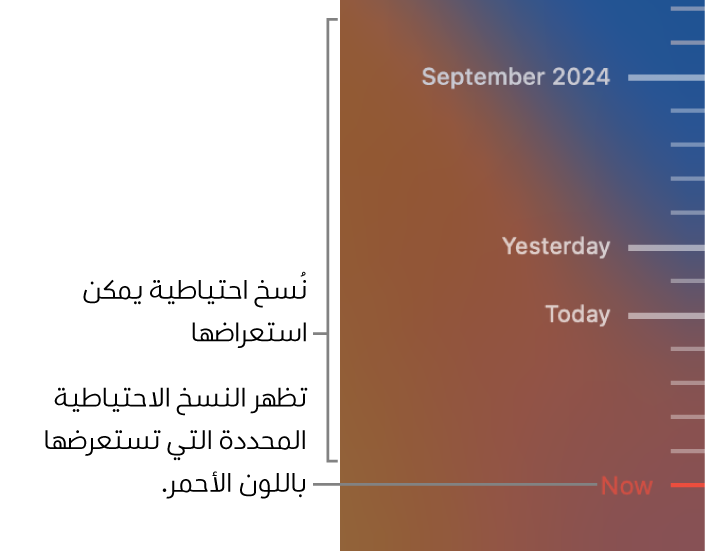 استخدم الأسهم الموجودة بجوار نوافذ فايندر للتنقل عبر النُسخ الاحتياطية. النسخة الاحتياطية المحددة حاليًا مميزة بالأحمر في المخطط الزمني على اليسار