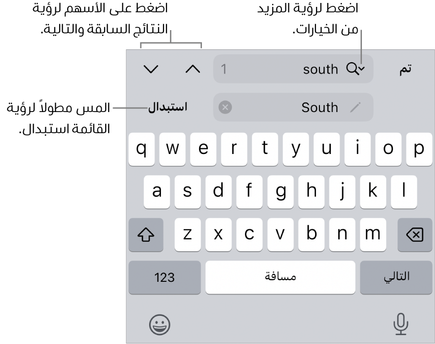 استبدال كل المطابقات بنص الاستبدال نفسه: في حقل النص السفلي، أدخل نص الاستبدال. المس "استبدال" مع الاستمرار ثم اضغط على "استبدال الكل".
