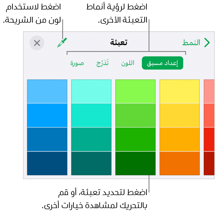 ، اضغط على النمط، ثم اضغط على تعبئة.