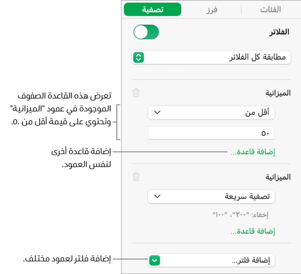 لإضافة قاعدة أخرى للعمود ذاته، انقر على إضافة قاعدة، ثم اختر قاعدة تصفية جديدة.