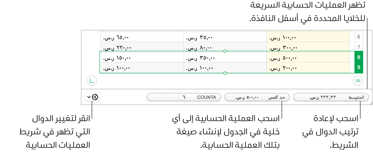 تظهر العمليات الحسابية للخلايا المحددة، مثل المجموع والمتوسط والحد الأدنى والحد الأقصى، في أسفل النافذة.