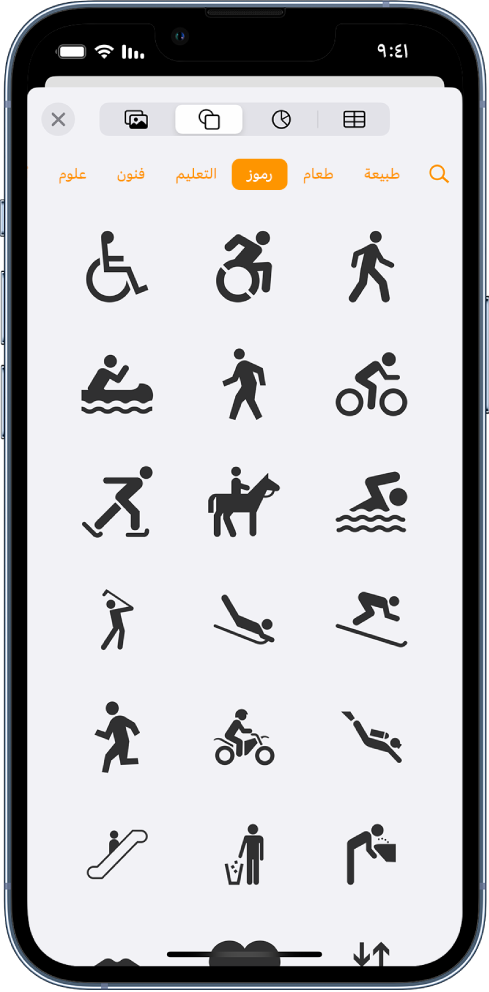 يمكنك إضافة كائنات مثل الجداول والمخططات والأشكال والوسائط (الصور والرسومات والصوت والفيديو) إلى المستند. يمكنك وضع الكائنات في طبقات وتغيير حجمها ووضعها في أي مكان بالصفحة.