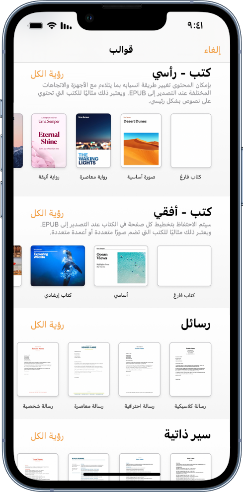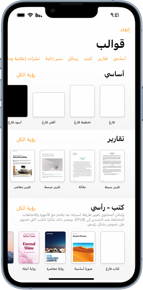 يتوفر Pages مع مجموعة من قوالب الكتب لمساعدتك على إنشاء كتب تفاعلية بتنسيق EPUB. يمكنك إضافة النصوص والصور وحتى جدول المحتويات. عندما تكون جاهزًا، يمكنك حتى إتاحة كتابك للشراء أو التنزيل في Apple Books.