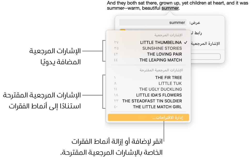 إنشاء إشارات مرجعية مقترحة جديدة: اختر إعداد الاقتراحات أو إدارة الاقتراحات (في أسفل القائمة المنبثقة)، حدد خانة الاختيار بجوار أنماط الفقرات التي تريد استخدامها للإشارات المرجعية، ثم انقر على تم. للربط باقتراح جديد، انقر على القائمة المنبثقة "الإشارة المرجعية" مرة أخرى، ثم اختر وجهة.