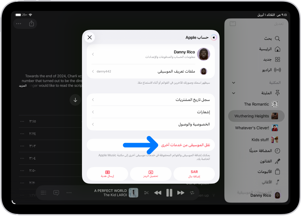 بمجرد الاشتراك، يمكنك بسهولة نقل موسيقاك من خدمات الموسيقى الأخرى إلى Apple Music. اضغط على أيقونة ملف التعريف في الزاوية السفلية اليمنى من الشريط الجانبي، ثم اضغط على نقل الموسيقى من خدمات أخرى. اتبع التعليمات التي تظهر على الشاشة لنقل مكتبتك الحالية أو قوائم التشغيل.