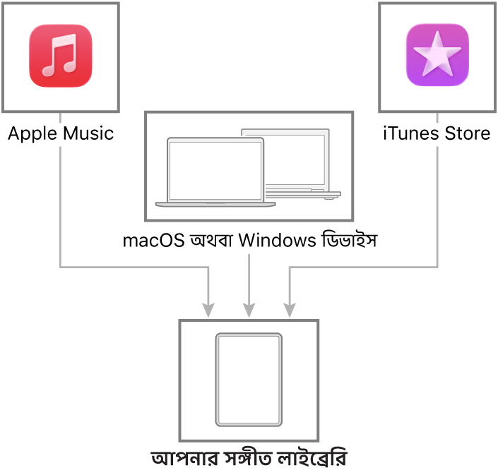 আপনার iPad ও আপনার ডিভাইসের মধ্যে সঙ্গীত ট্রান্সফার এবং আপডেট করতে আপনার Mac বা Windows ডিভাইস কানেক্ট করুন। সমর্থিত বিষয়বস্তু সিঙ্ক করতে, সঙ্গীত (macOS 10.15 বা এর পরবর্তী ভার্সন) অথবা iTunes (macOS 10.14 বা এর আগের ভার্সন ও Windows ডিভাইস) ব্যবহার করুন।