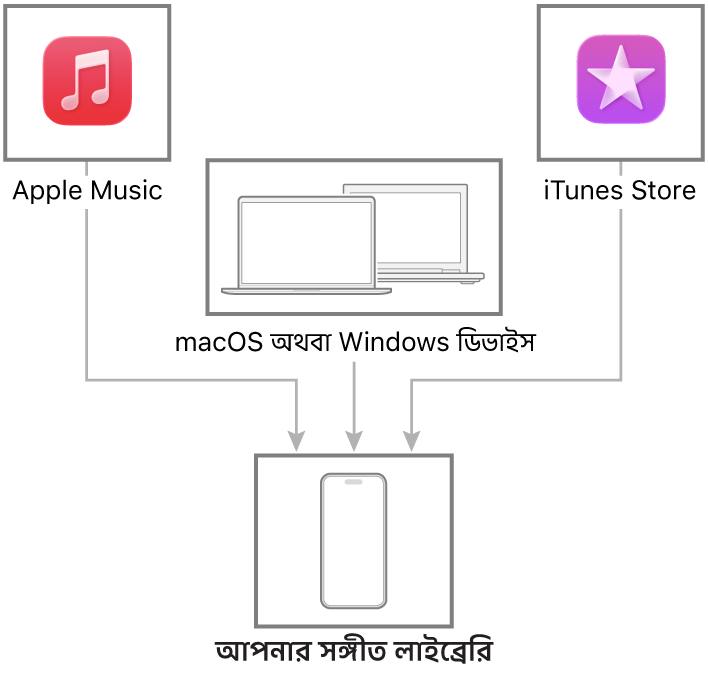 আপনার iPhone থেকে আপনার ডিভাইসে সঙ্গীত ট্রান্সফার এবং আপডেট করতে আপনার Mac বা Windows ডিভাইস কানেক্ট করুন। সমর্থিত বিষয়বস্তু সিঙ্ক করতে, সঙ্গীত (macOS 10.15 বা তার পরবর্তী ভার্সনে) বা iTunes (macOS 10.14 বা এর পূর্ববর্তী ভার্সনে এবং Windows ডিভাইসে) ব্যবহার করুন।