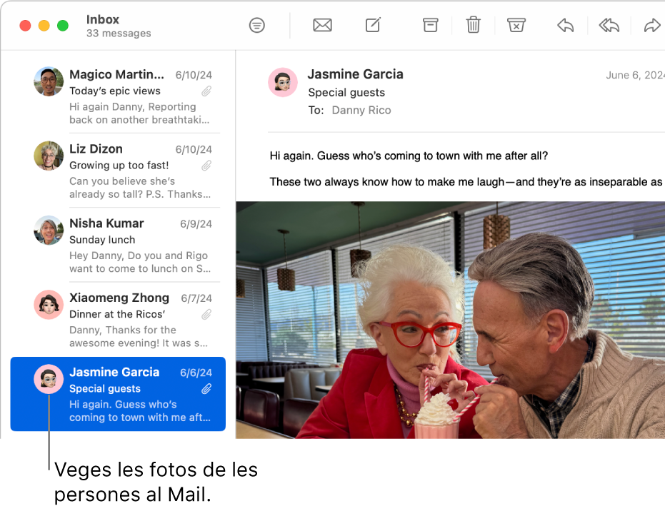 Mail pot mostrar-te, i mostrar a altres persones, una imatge als missatges de correu electrònic, en funció de les imatges que estiguin disponibles a l’app Contactes. Les imatges només les veurà l’usuari; no s’inclouran als correus electrònics. Consulta Mostrar les imatges de les persones al Mail.