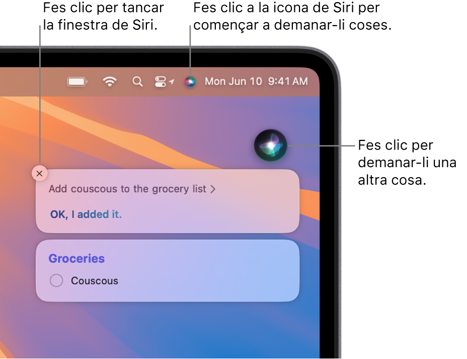 Siri és un assistent intel·ligent integrat al Mac que t’ajuda a fer tasques. Un cop activis Siri, podràs utilitzar‑lo per fer les tasques diàries amb la veu o escrivint les teves peticions. Com més utilitzis Siri, millor sabrà què necessites.