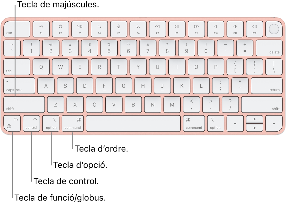 Nota: Si tens un Magic Keyboard d’Apple amb Touch ID i teclat numèric, trobaràs la tecla de funció o globus a la dreta de la tecla de supressió.
