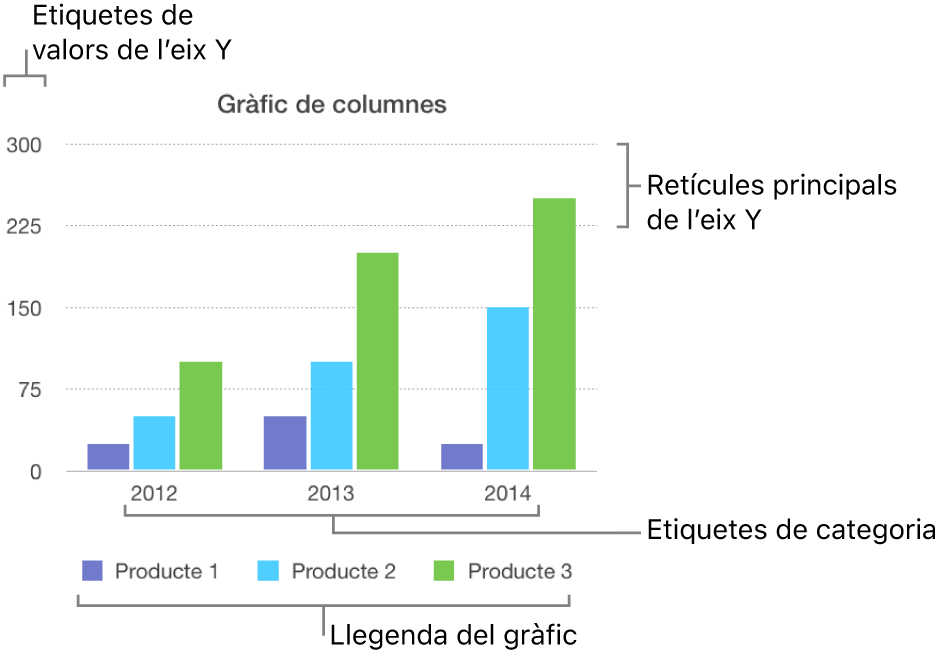 Les línies axials defineixen la vora del gràfic i de vegades també marquen el valor zero, com una vora interior. Les línies de retícula espaiades uniformement creuen el gràfic i proporcionen una referència visual per als grans increments dels valors. Pots especificar si vols que es mostrin les línies axials i les línies de retícula dels gràfics i modificar‑ne l’aspecte.