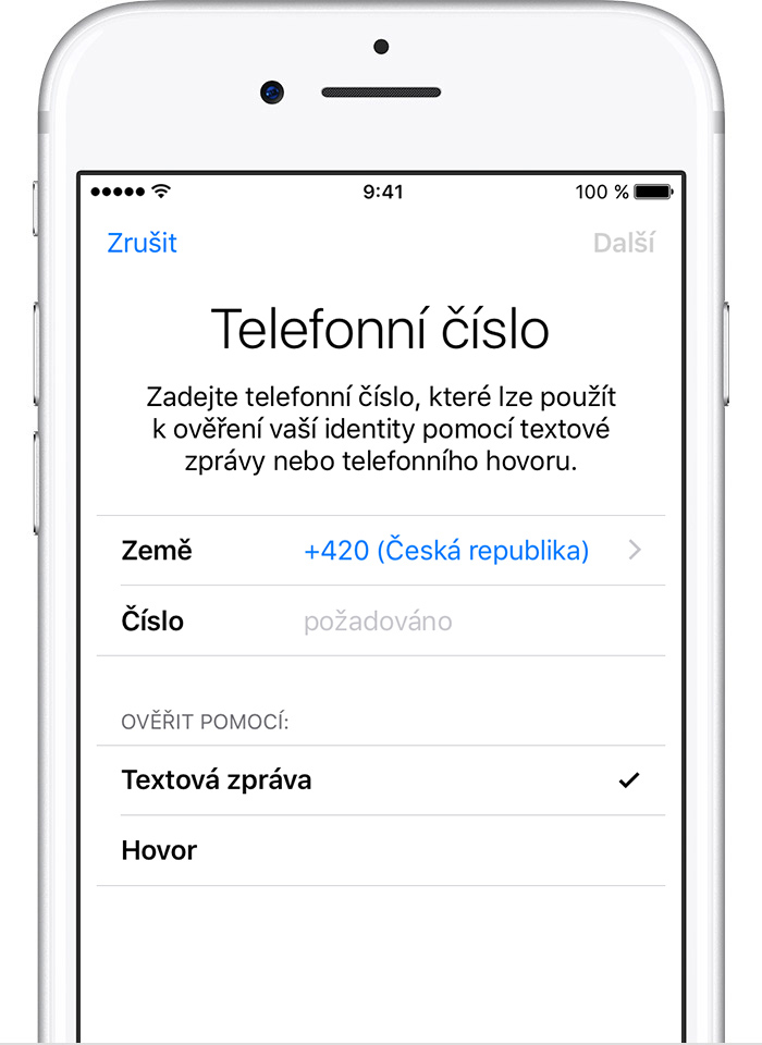Až klepnete na Dále, Apple vám na zadané telefonní číslo pošle ověřovací kód.