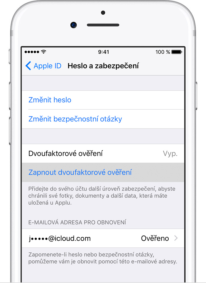 Dvoufaktorové ověřování je v tuto chvíli dostupné uživatelům iCloudu, kteří mají alespoň jedno zařízení s iOS 9 nebo OS X El Capitan a novějším. Další informace.