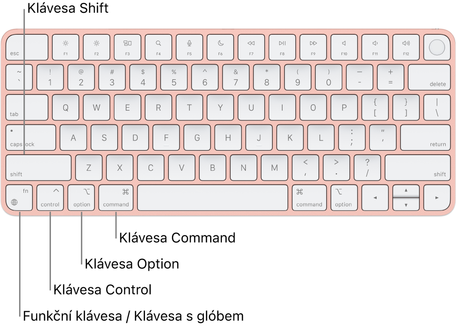 Poznámka: Pokud používáte klávesnici Magic Keyboard od Apple, vybavenou snímačem Touch ID a numerickou klávesnici, bude funkční klávesa Fn / klávesa s glóbem napravo od klávesy Delete.