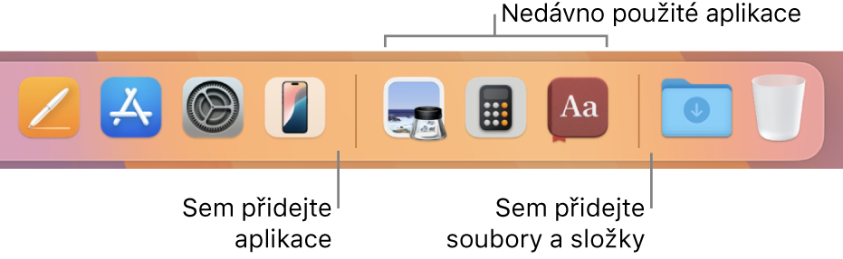 Přetáhněte aplikace nalevo od čáry, která odděluje nedávno použité aplikace. Přetáhněte soubory a složky napravo od druhé čáry, která odděluje nedávno použité aplikace. Pokud jste Dock na ploše přesunuli na stranu, přetahujte soubory a složky pod oddělovač a aplikace nad něj.