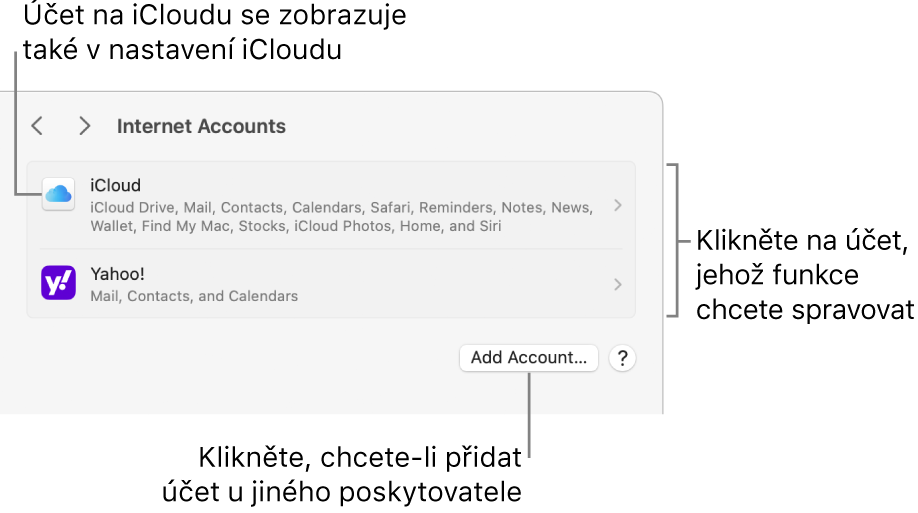 Když iCloud nastavíte prostřednictvím nastavení iCloud účtu Apple, zobrazí se odpovídající volby také v nastavení Internetové účty. Jeho nastavení je možné měnit z libovolné z těchto předvoleb.