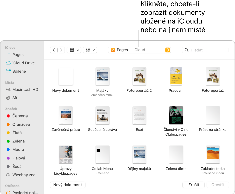 Otevření dokumentu na Macu: V případě dokumentu aplikace Pages dvakrát klikněte na jeho název či miniaturu nebo ho přetáhněte na ikonu Pages v Docku či ve složce Aplikace. V případě dokumentu aplikace Word ho přetáhněte na ikonu Pages (pokud máte aplikaci Word nainstalovanou, dvojí kliknutí na soubor by ji otevřelo). V Pages nelze otevřít dokumenty PDF.