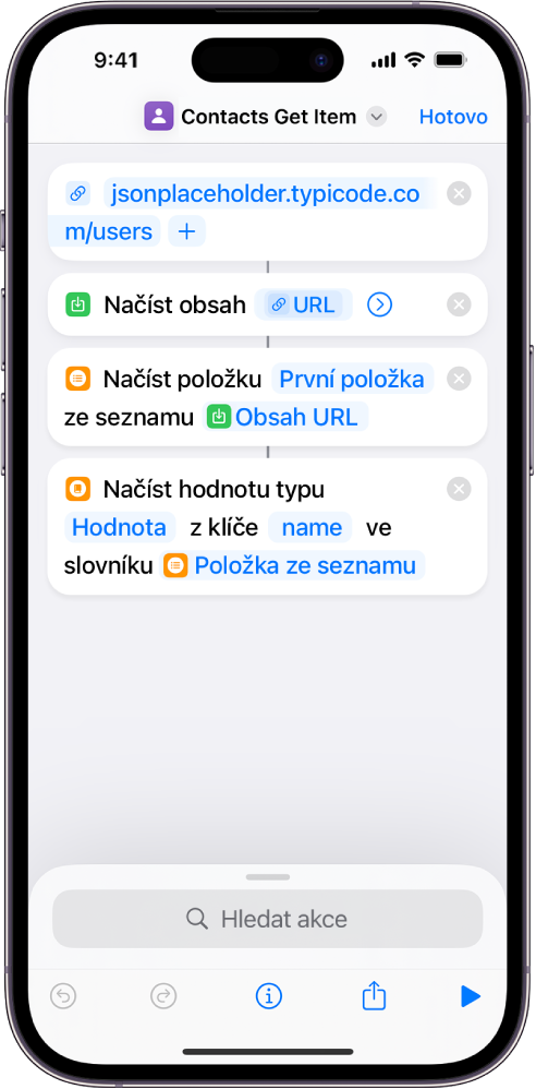 na iPhonu nebo iPadu přidejte za akci „Načíst obsah URL“ akci „Načíst položku ze seznamu“.Tato akce automaticky převezme výstup od předchozí akce.