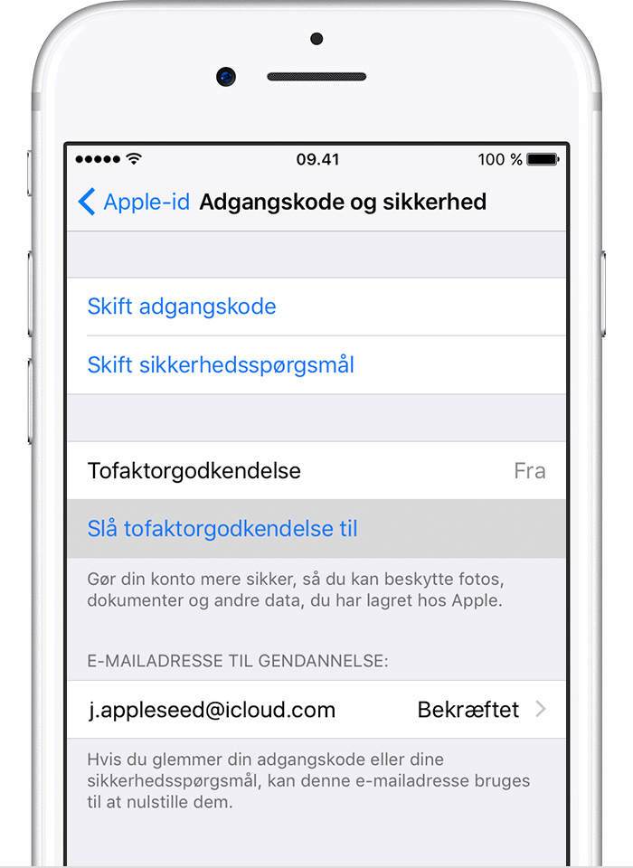 Tofaktorgodkendelse er i øjeblikket tilgængelig for iCloud-brugere med mindst én enhed, der kører iOS 9 eller OS X El Capitan eller en nyere version. Læs mere.