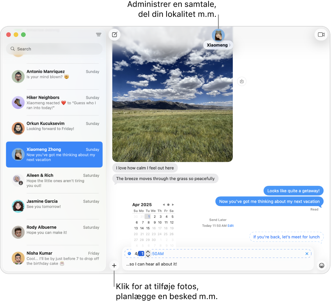 Hold kontakten ved at sende og modtage beskeder og medier direkte fra din Mac. Søgning gør det lettere at finde beskeder hurtigt, og du kan fastgøre dine favoritsamtaler øverst, så du hurtigt kan komme i kontakt med de personer, du chatter mest med.