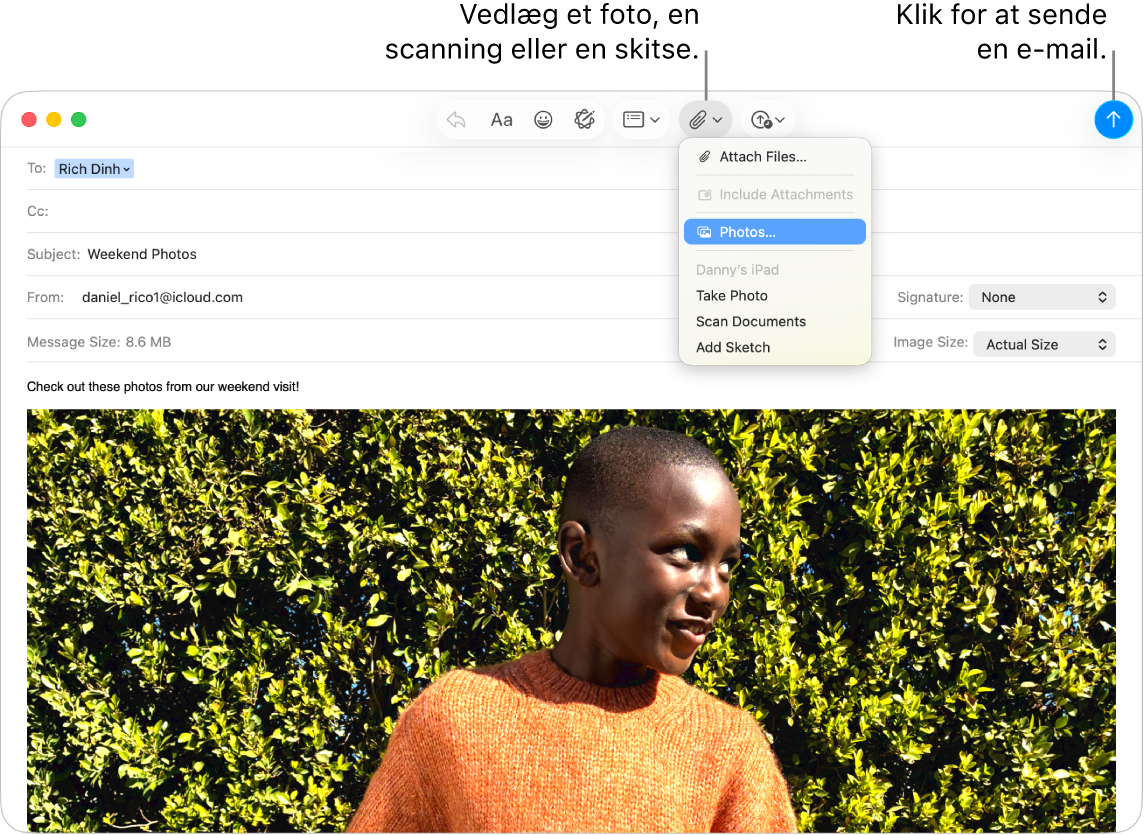 Send fotos eller andre arkiver. Du kan inkludere fotos, dokumenter m.m., når du skriver e-mailbeskeder. Du kan tilføje arkiver eller fotos ved at klikke på , klikke på Vedlæg arkiver eller fotos og vælge det arkiv eller foto, du vil sende.